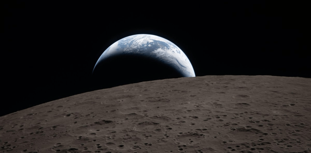 Esta es la vista del amanecer de la Tierra («amanecer terrestre») que tomó la misión Artemis II, pero desde la perspectiva de la superficie lunar. Se ve claramente ese momento en que el Sol va iluminando poco a poco el planeta.